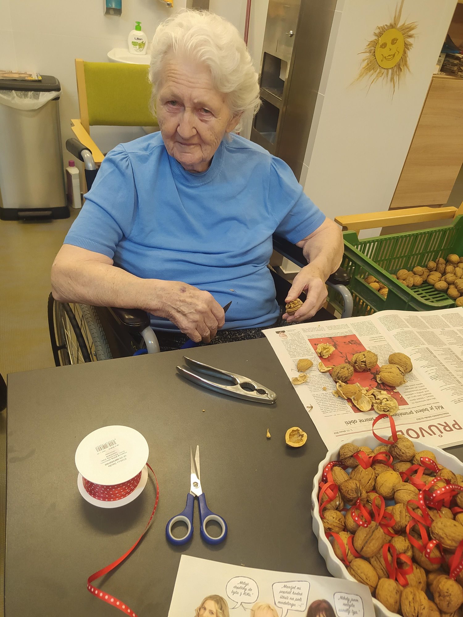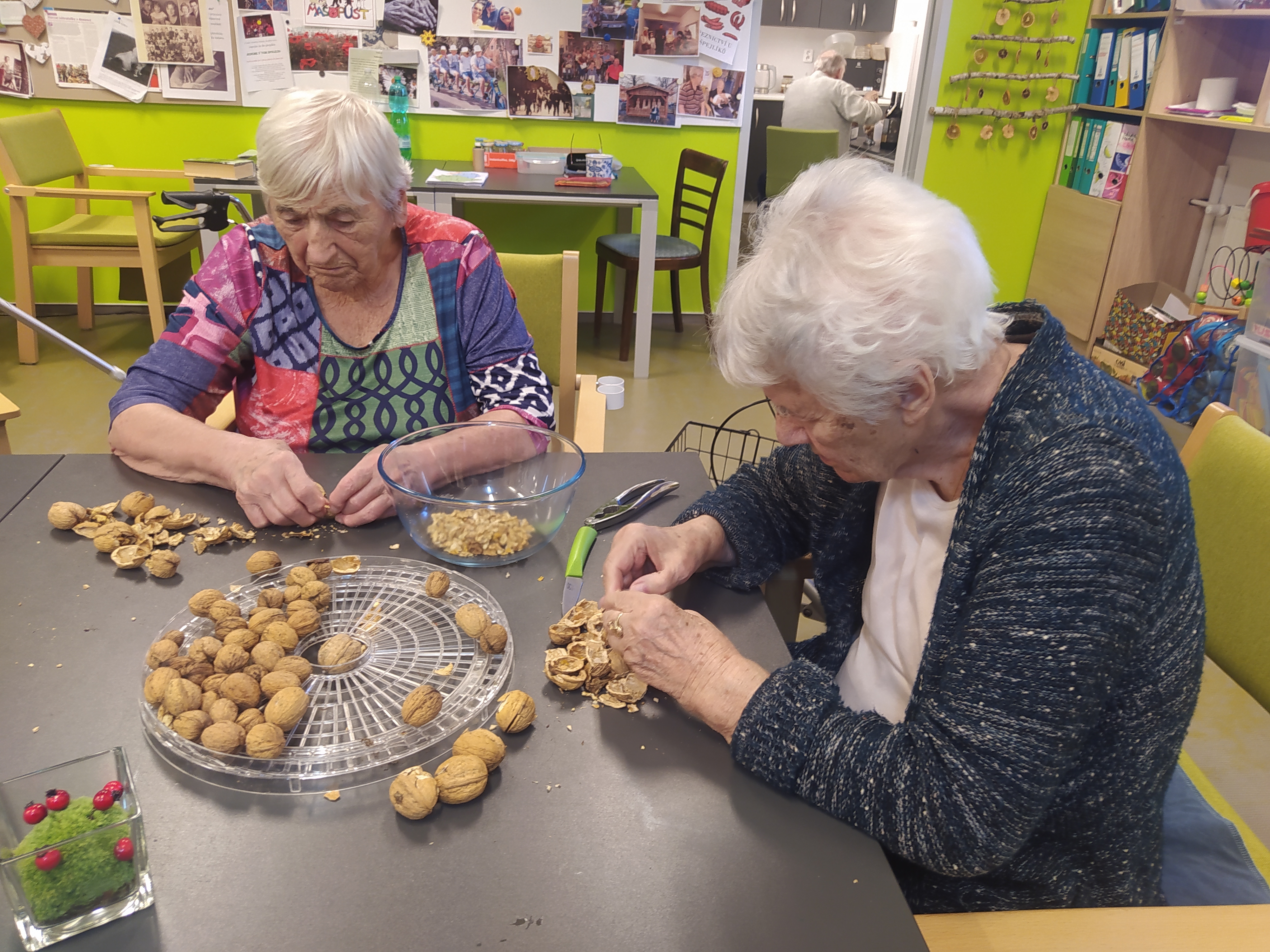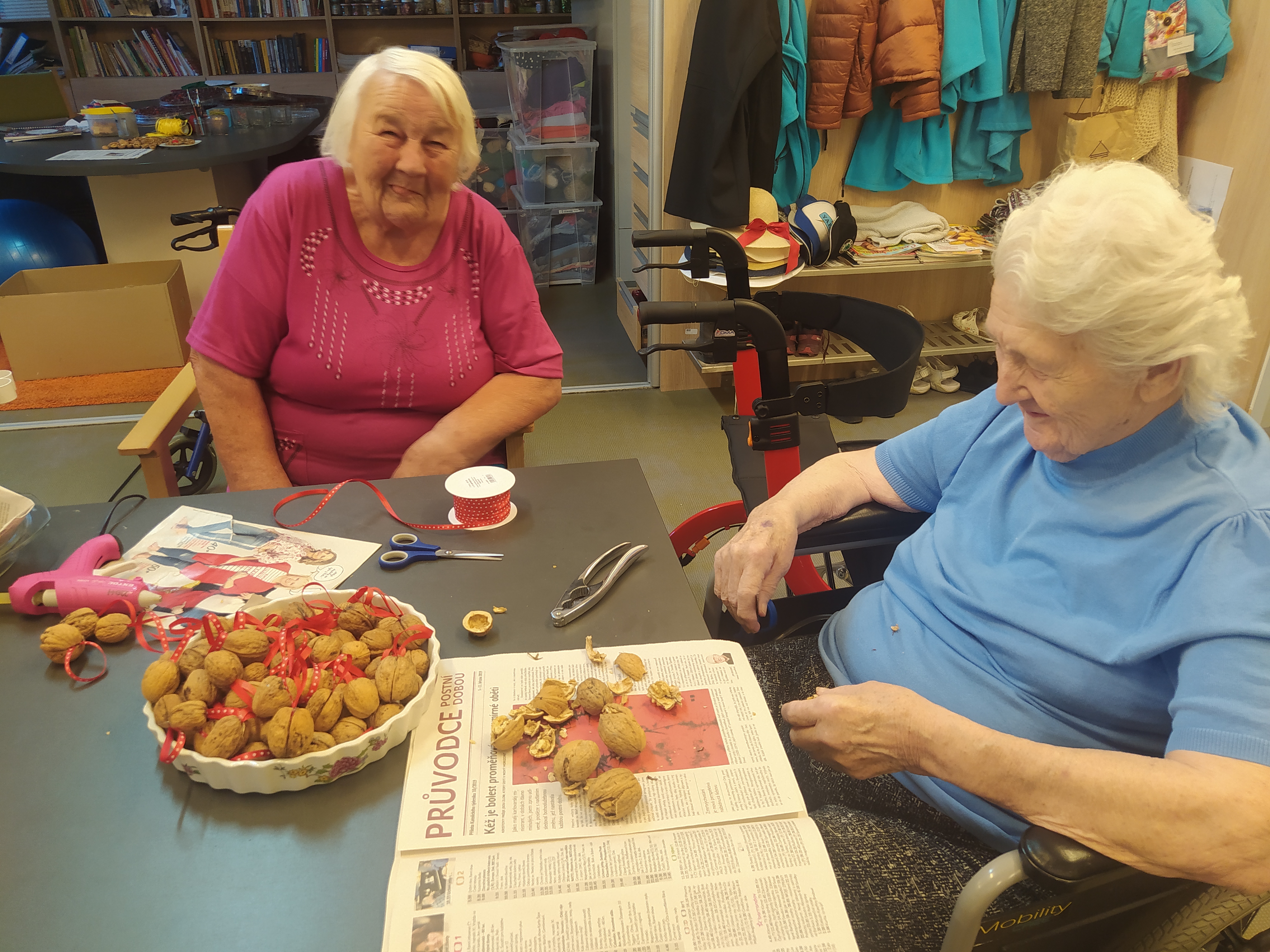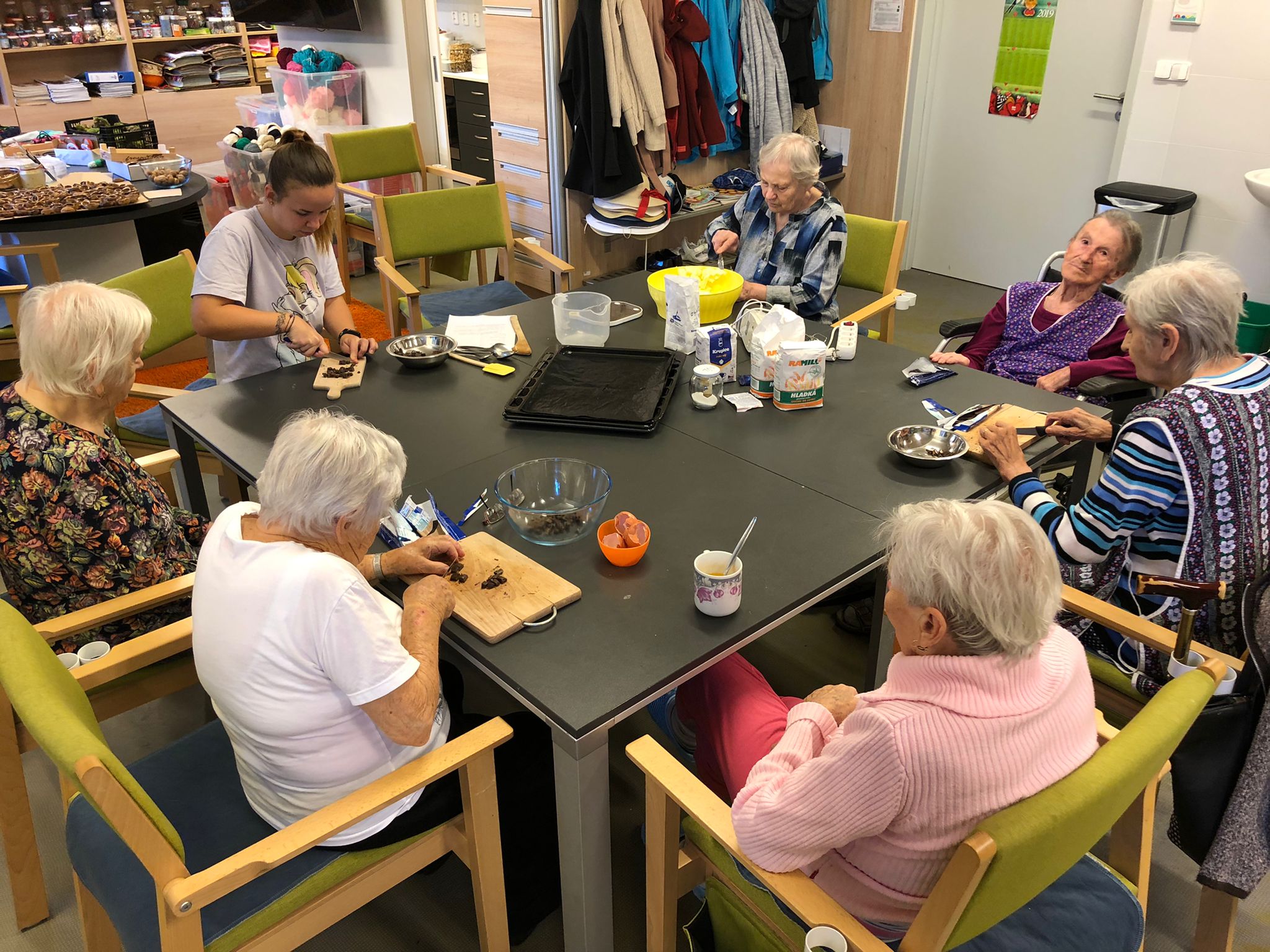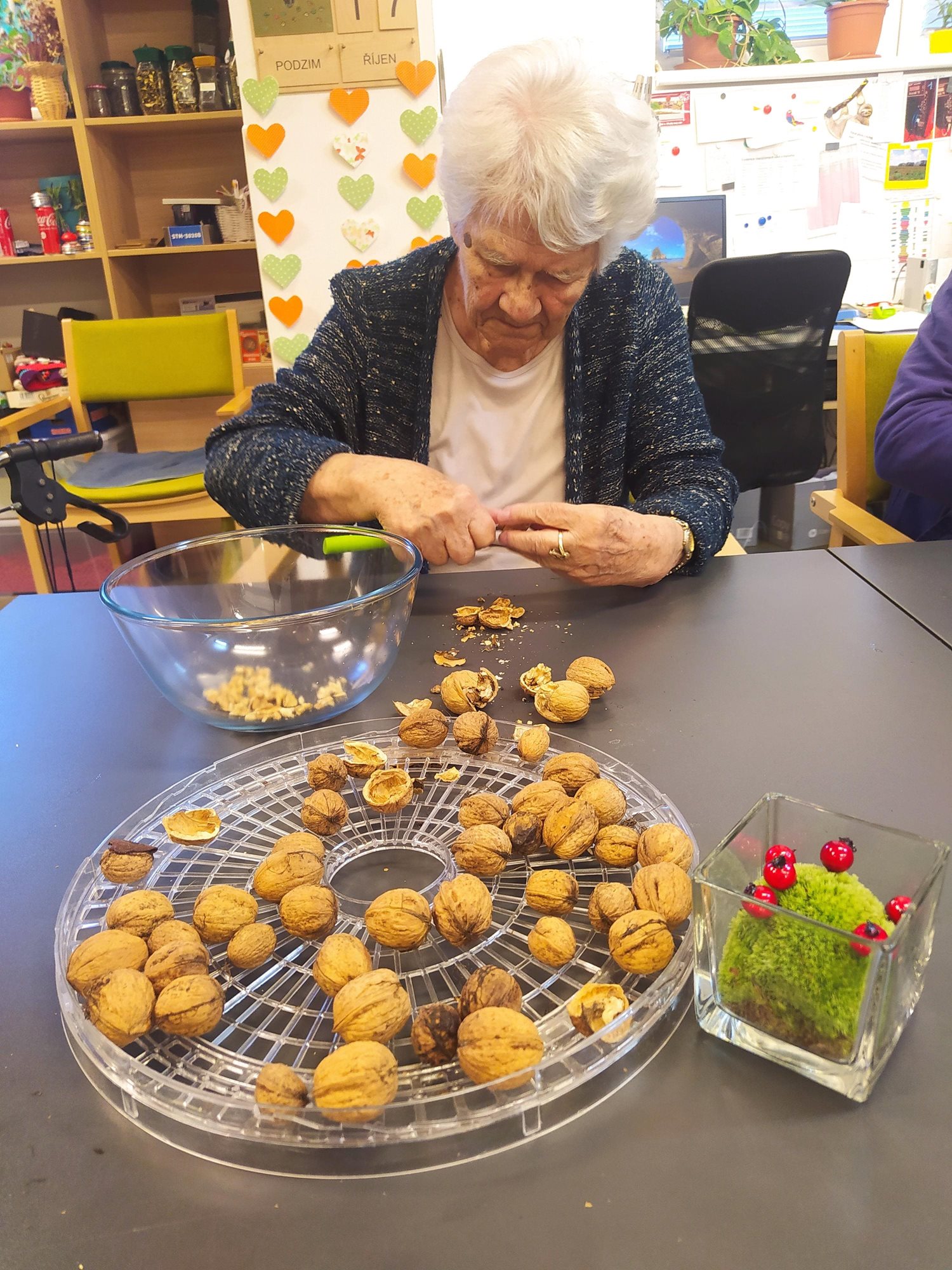 Během října jsme toho opět stihli hodně. Tvořili jsme podzimní motivy, vyráběli svícínky, pekli bábovky, sbírali ořechy, které jsme poté vyloupali a zdobili. Společný čas jsme strávili u cvičení, zpívání a procházkách. Aktivizace se na odpoledne změnila na biograf. Potěšili nás psí společníci při canisterapii. Naložili jsme zelí, které jsme si i nakrouhali.