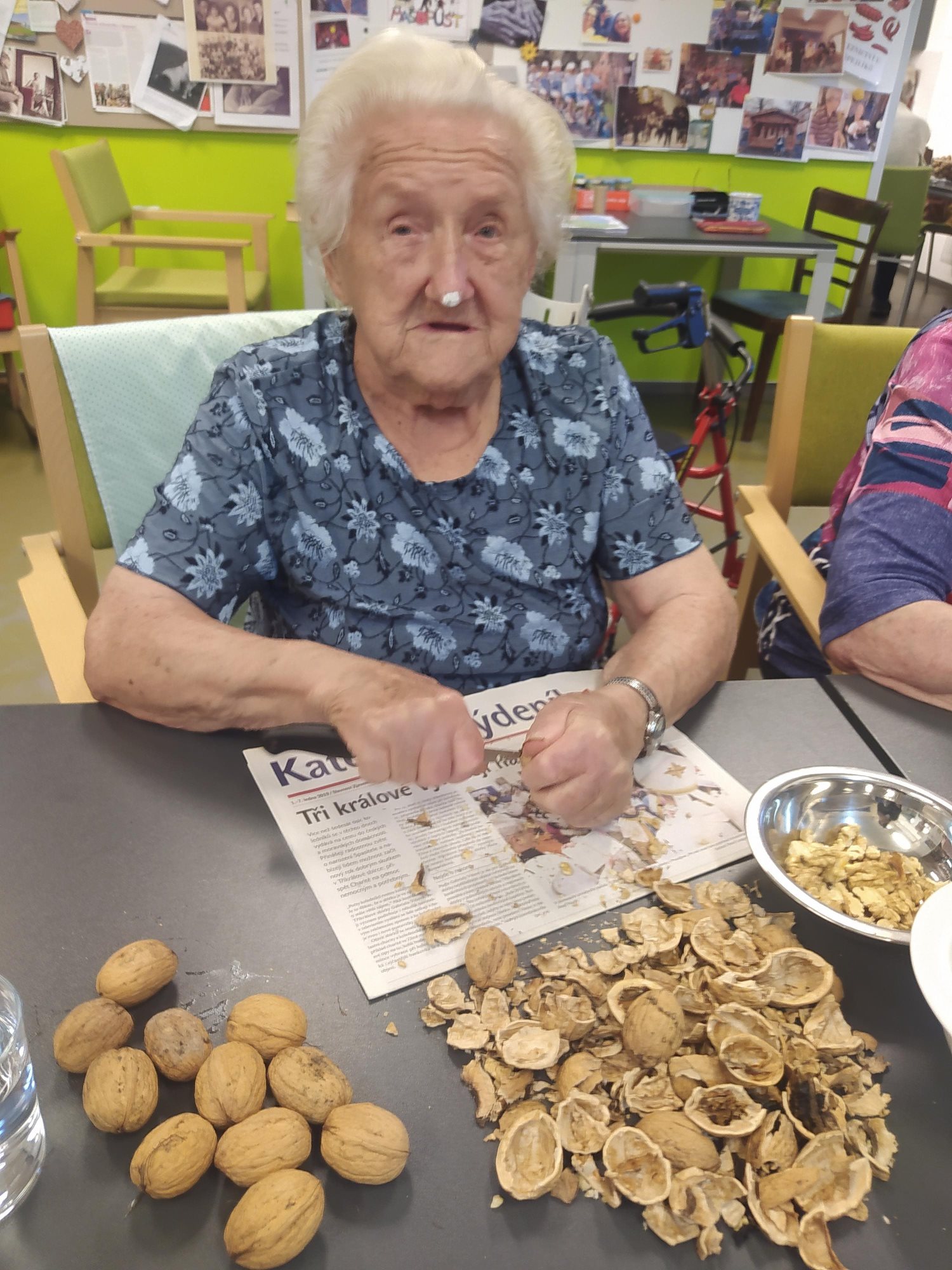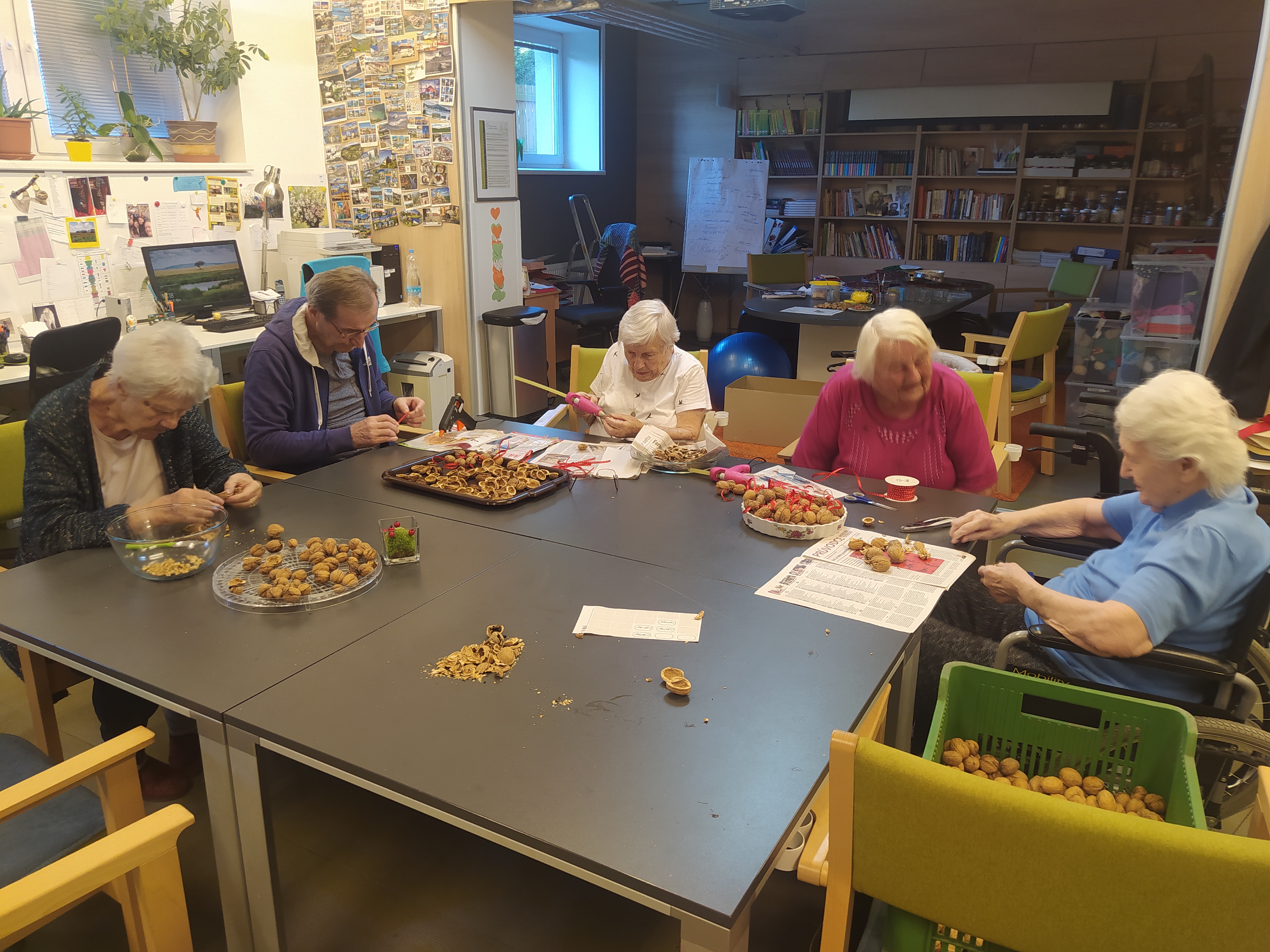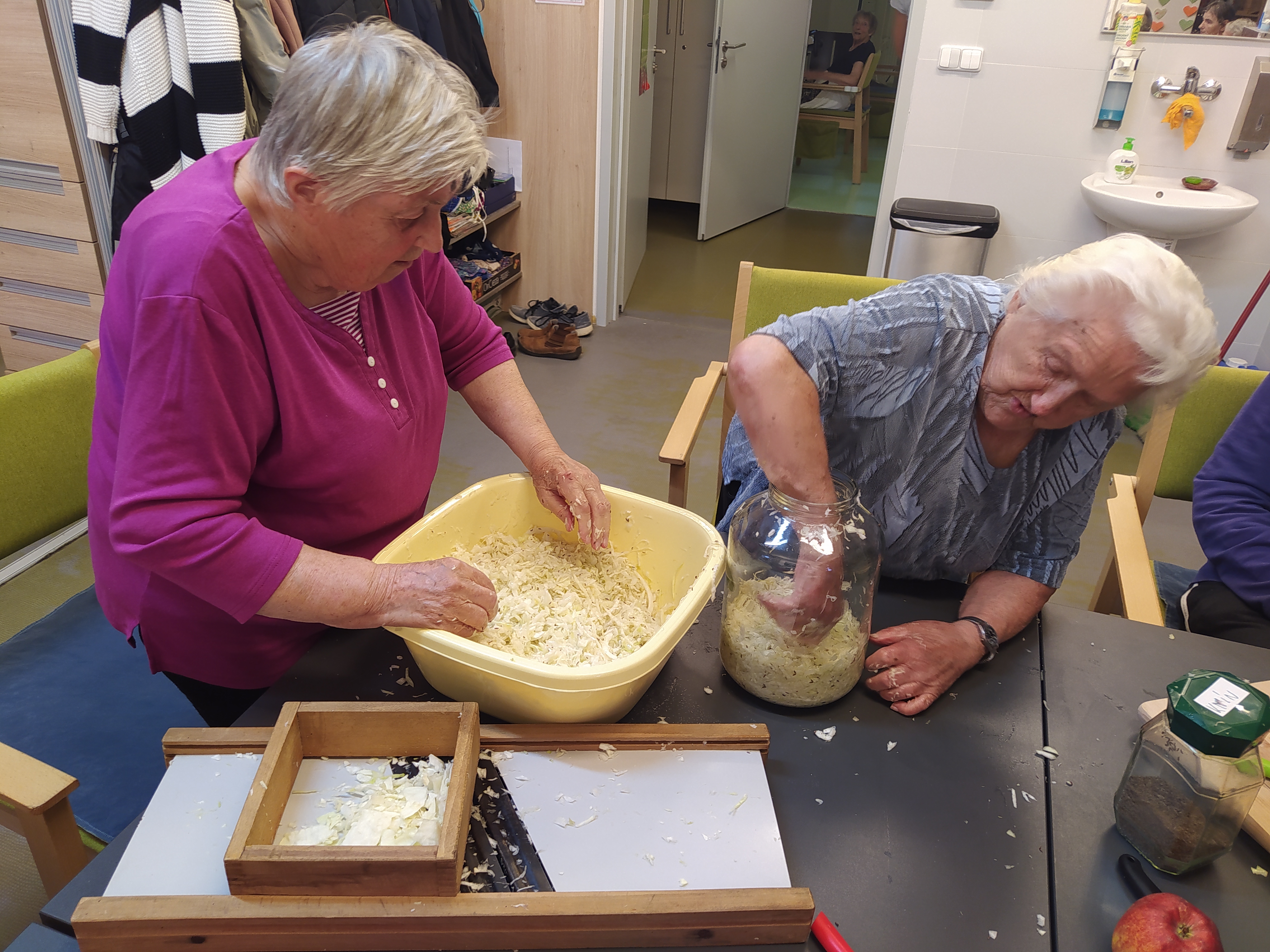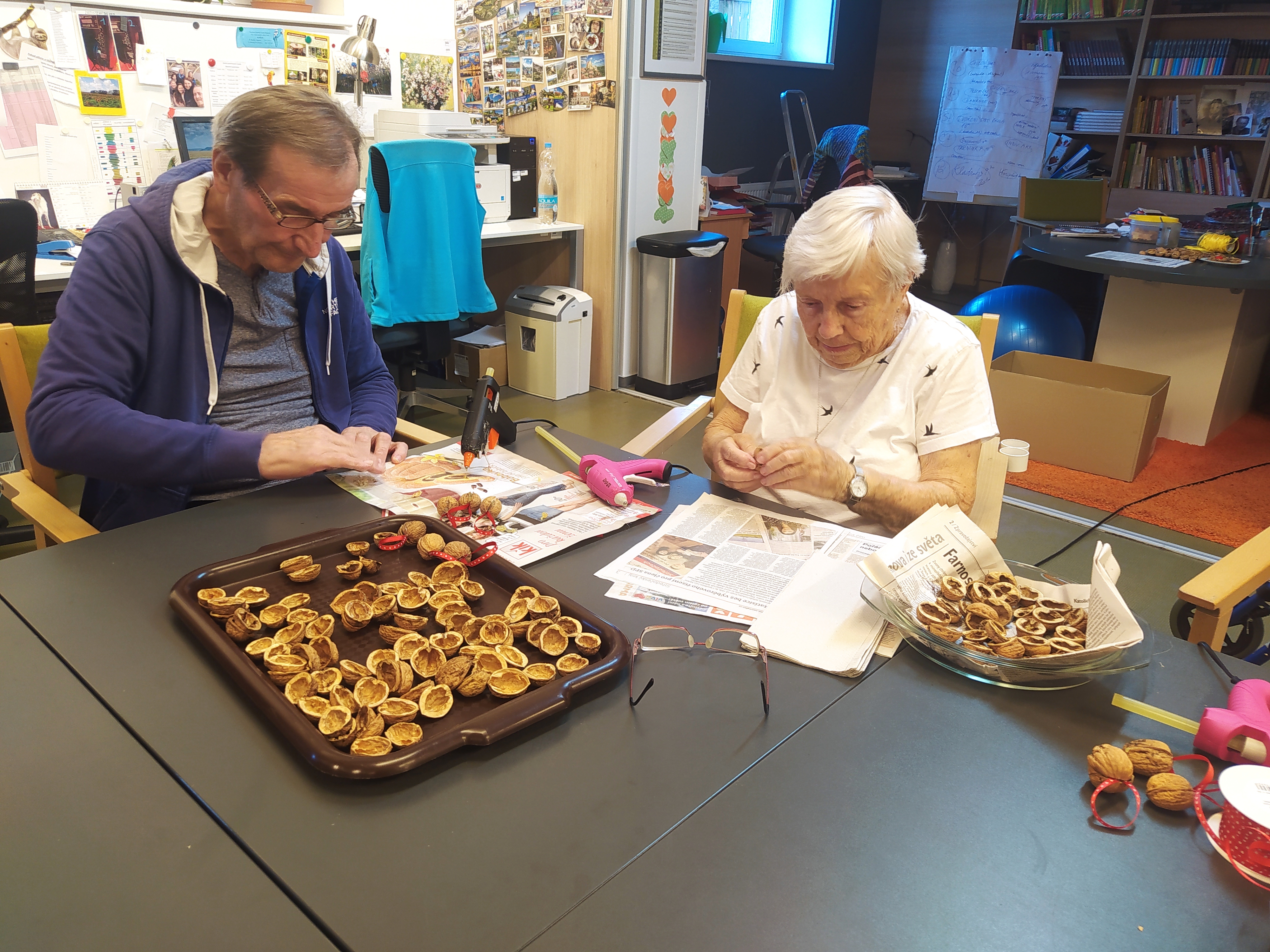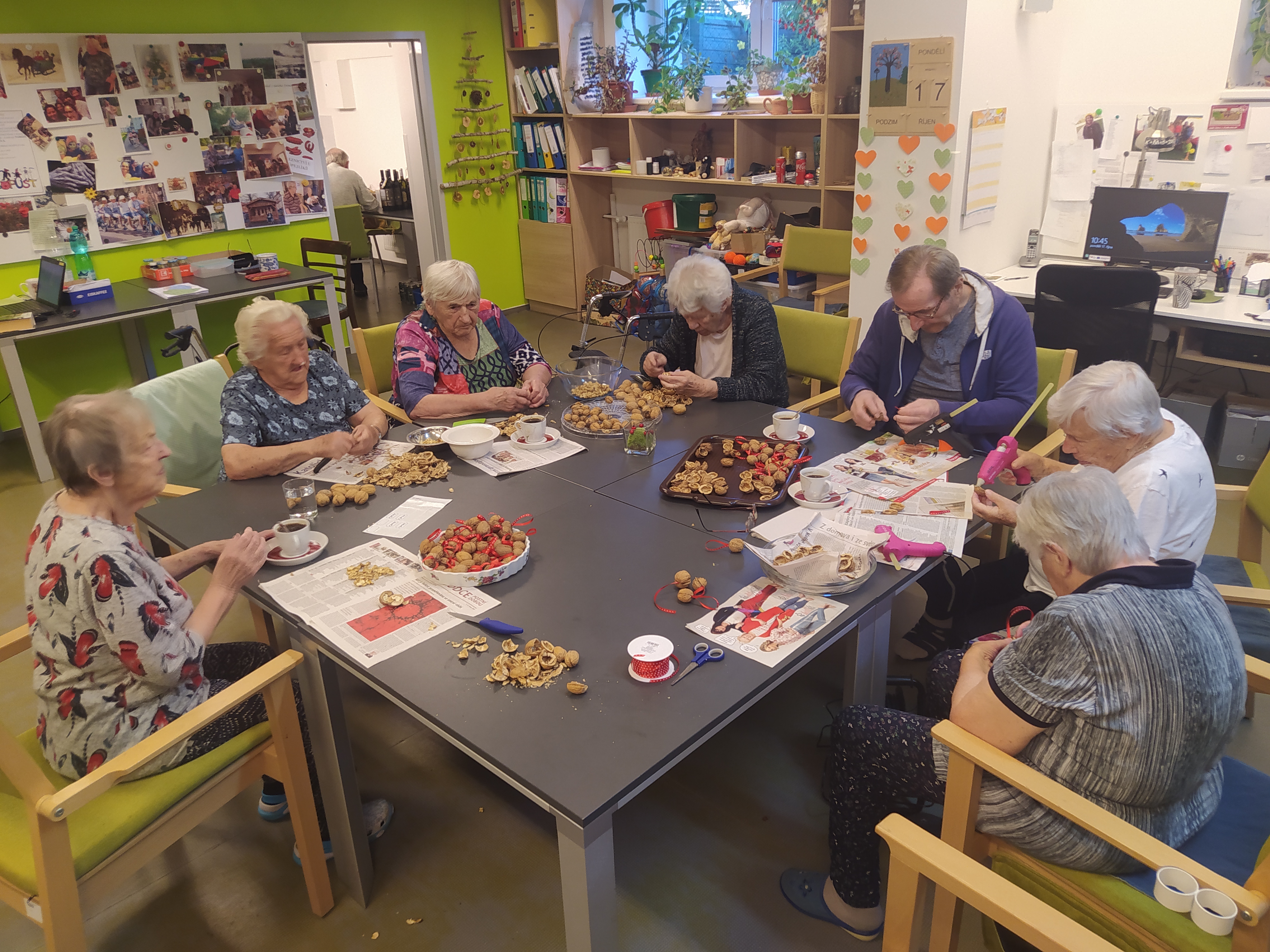 Během října jsme toho opět stihli hodně. Tvořili jsme podzimní motivy, vyráběli svícínky, pekli bábovky, sbírali ořechy, které jsme poté vyloupali a zdobili. Společný čas jsme strávili u cvičení, zpívání a procházkách. Aktivizace se na odpoledne změnila na biograf. Potěšili nás psí společníci při canisterapii. Naložili jsme zelí, které jsme si i nakrouhali.