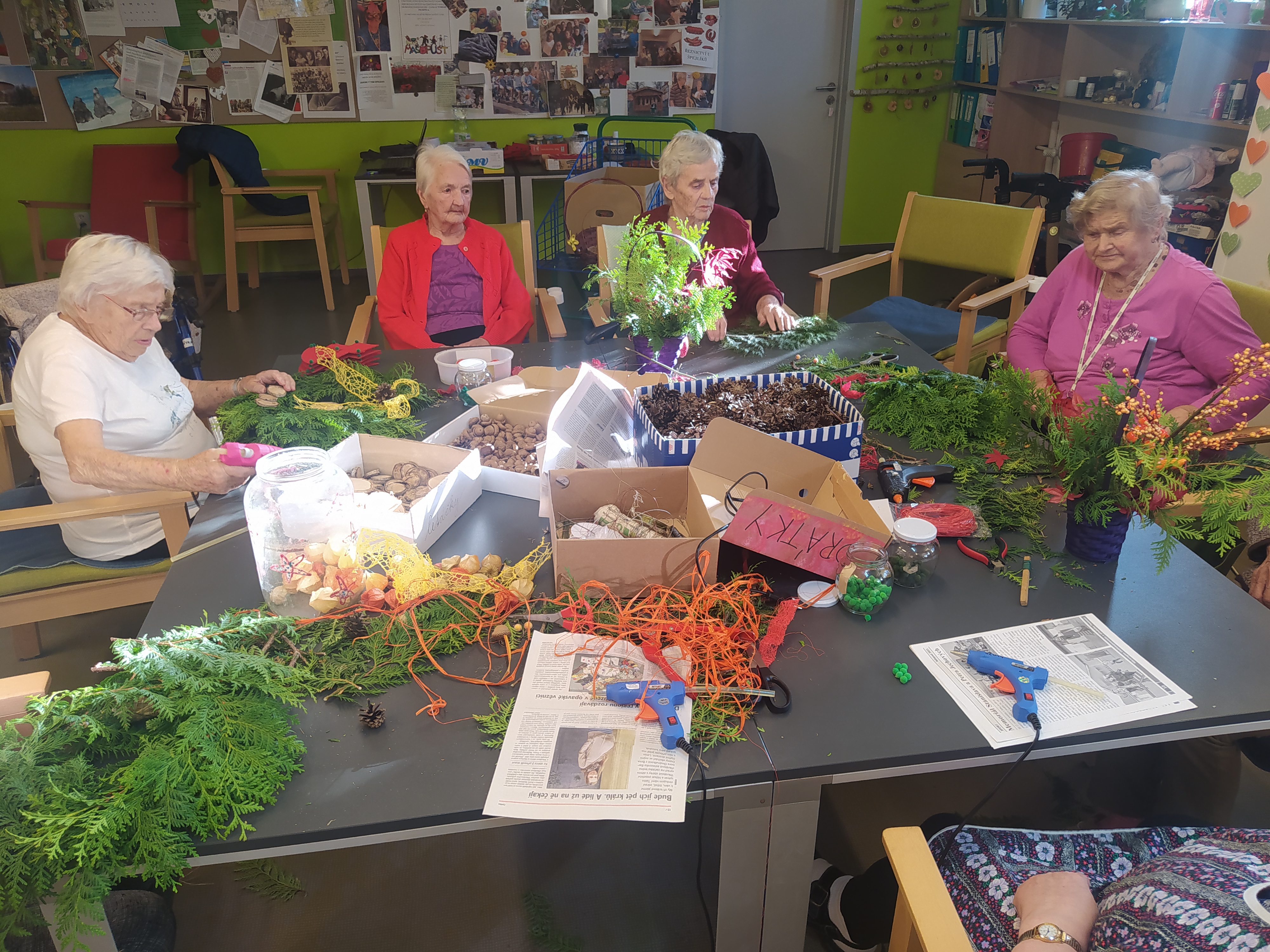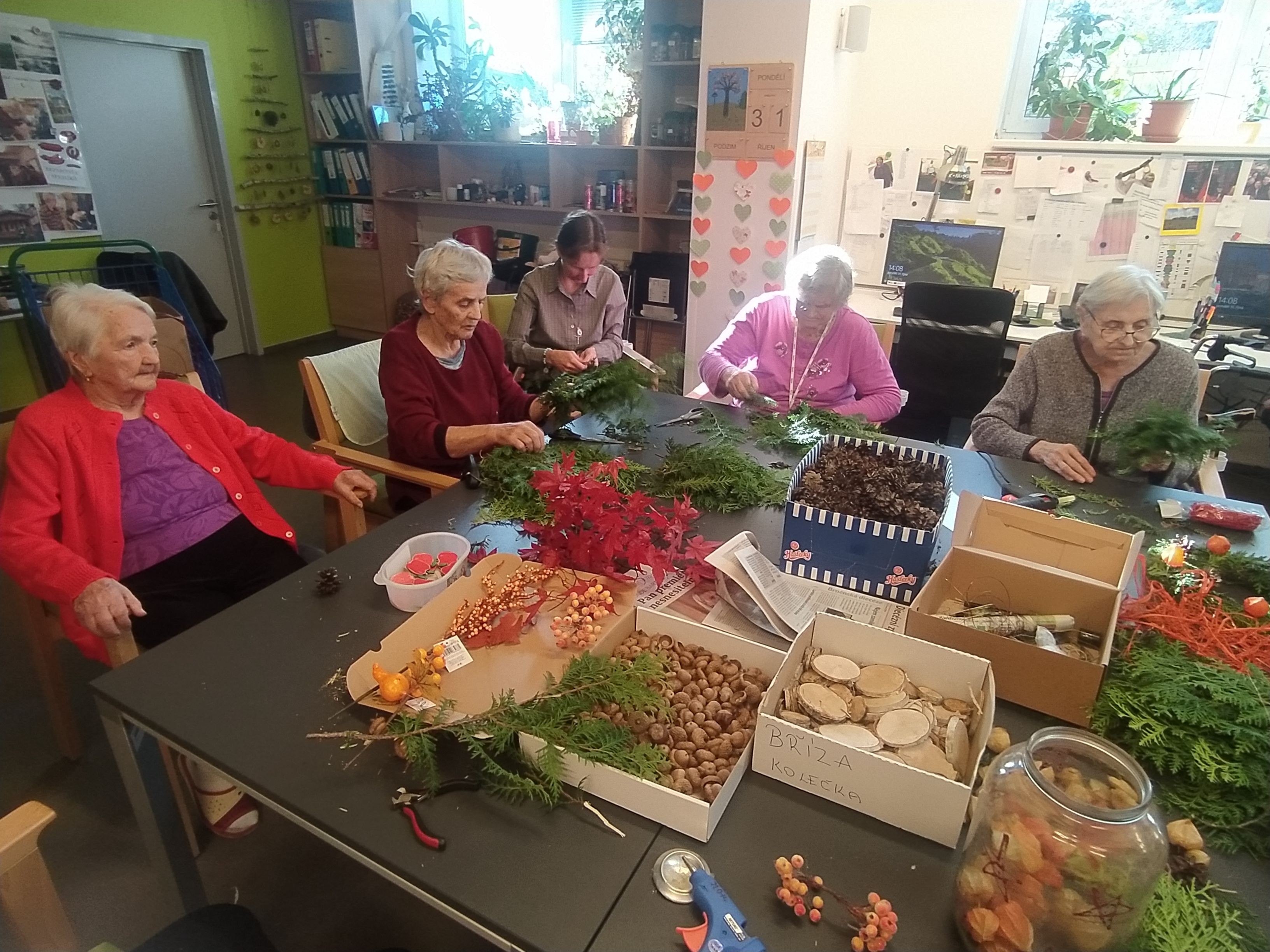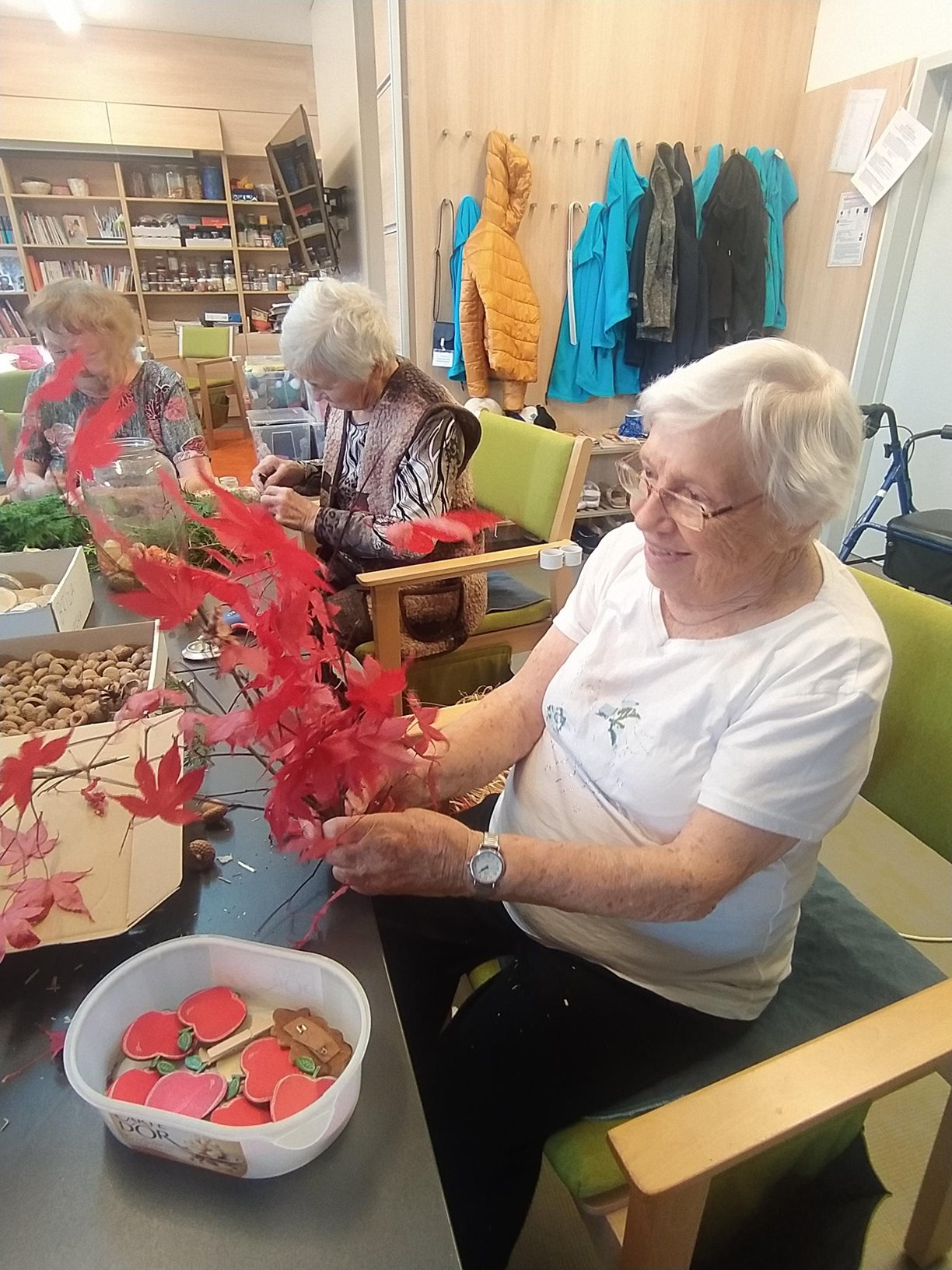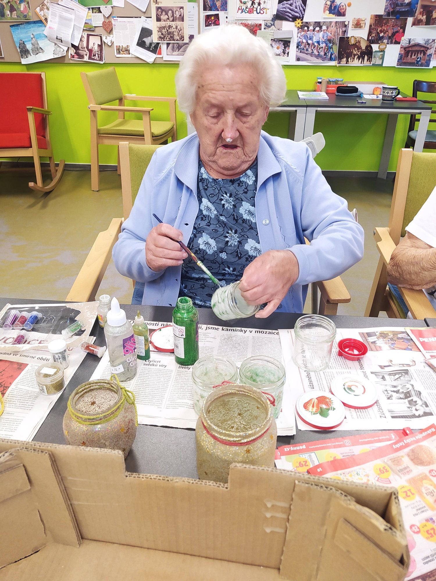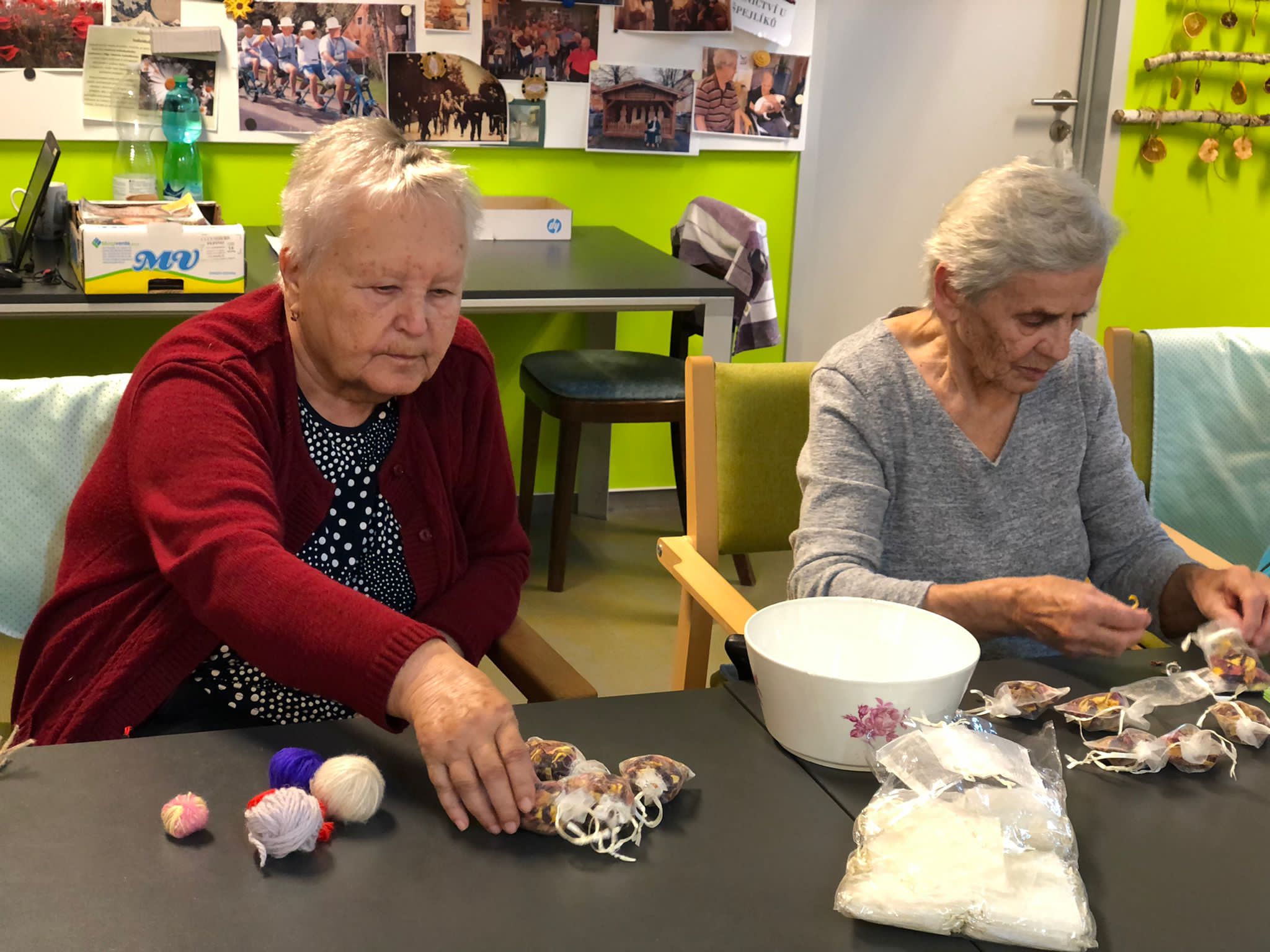 Během října jsme toho opět stihli hodně. Tvořili jsme podzimní motivy, vyráběli svícínky, pekli bábovky, sbírali ořechy, které jsme poté vyloupali a zdobili. Společný čas jsme strávili u cvičení, zpívání a procházkách. Aktivizace se na odpoledne změnila na biograf. Potěšili nás psí společníci při canisterapii. Naložili jsme zelí, které jsme si i nakrouhali.