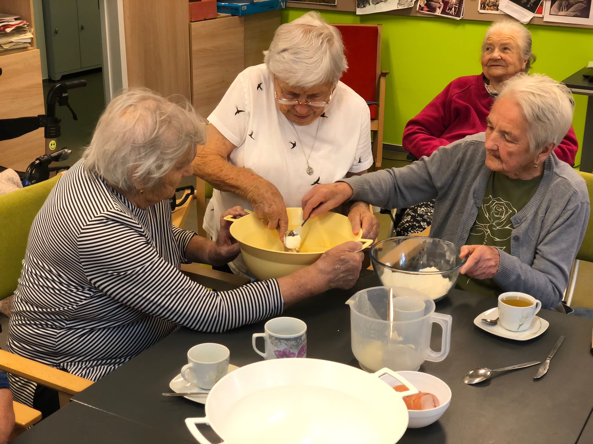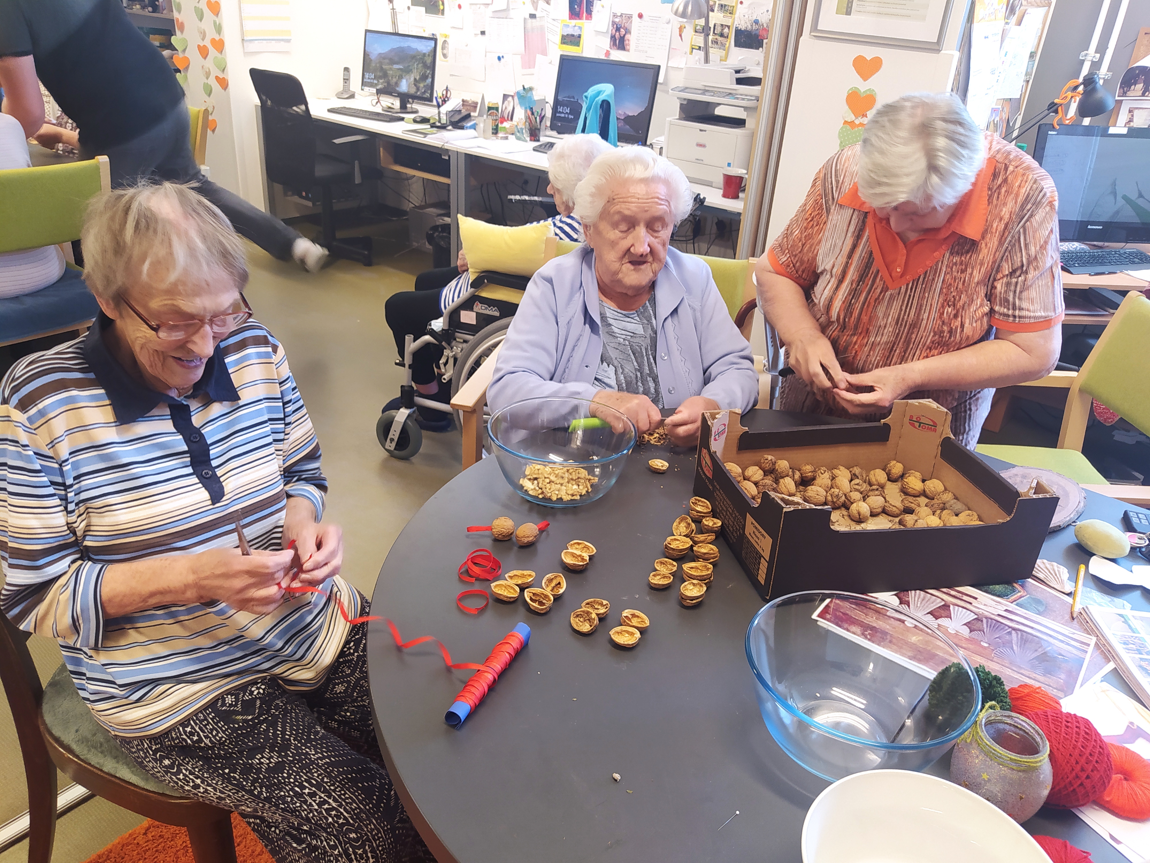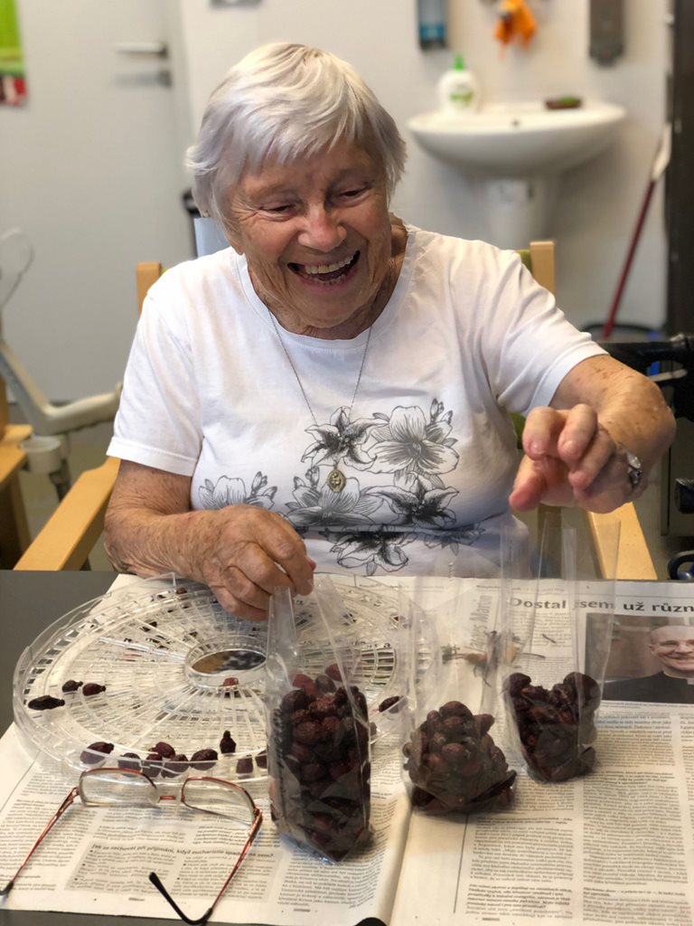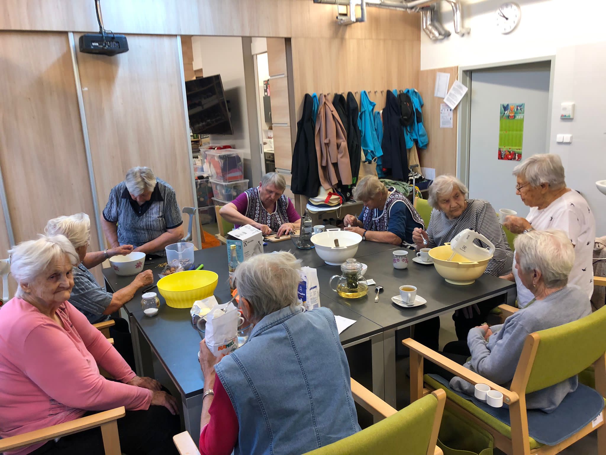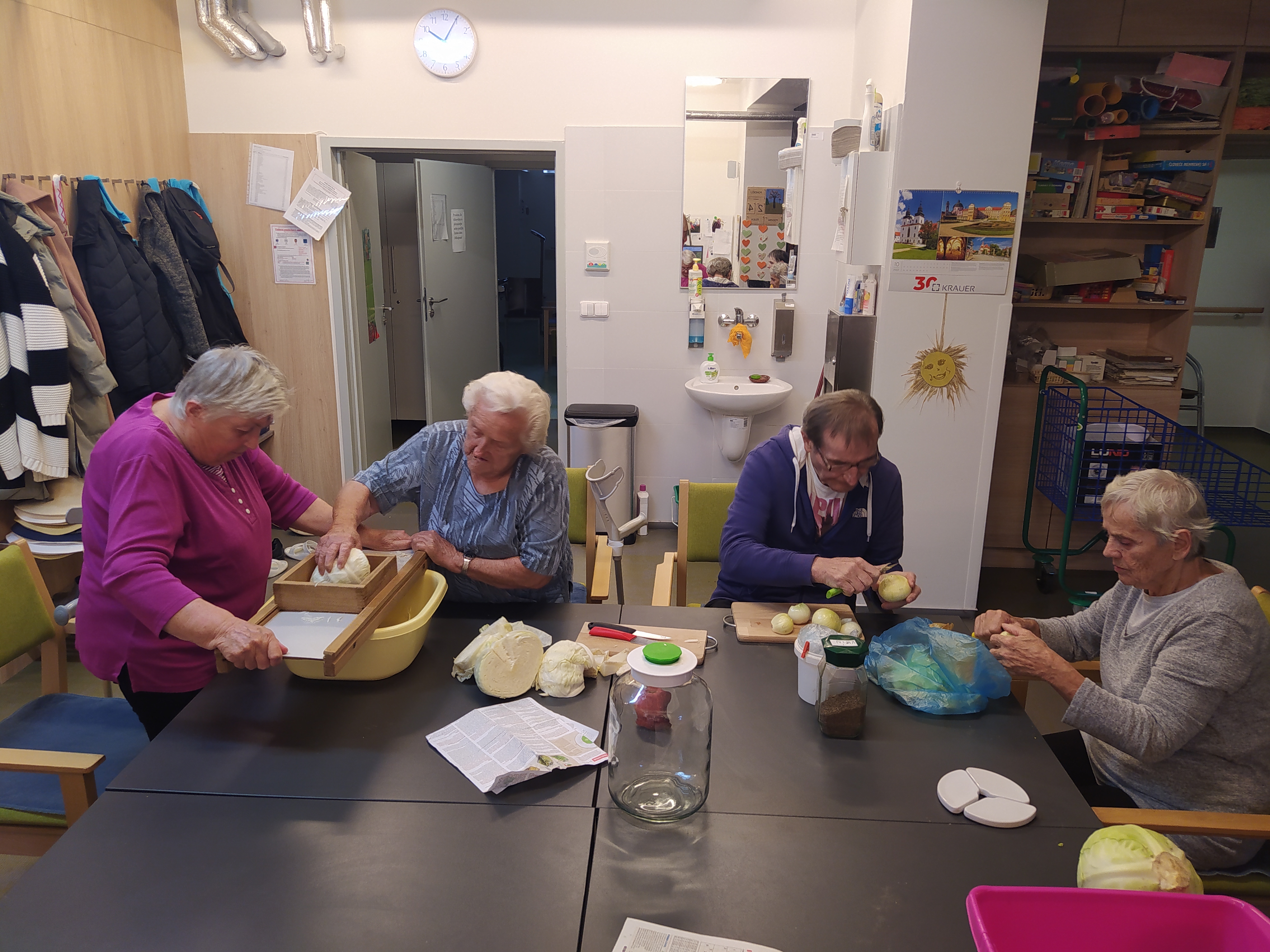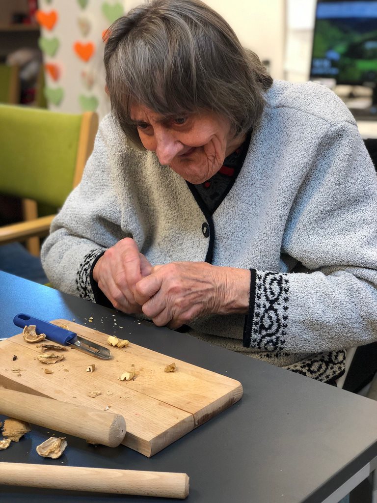 Během října jsme toho opět stihli hodně. Tvořili jsme podzimní motivy, vyráběli svícínky, pekli bábovky, sbírali ořechy, které jsme poté vyloupali a zdobili. Společný čas jsme strávili u cvičení, zpívání a procházkách. Aktivizace se na odpoledne změnila na biograf. Potěšili nás psí společníci při canisterapii. Naložili jsme zelí, které jsme si i nakrouhali.
