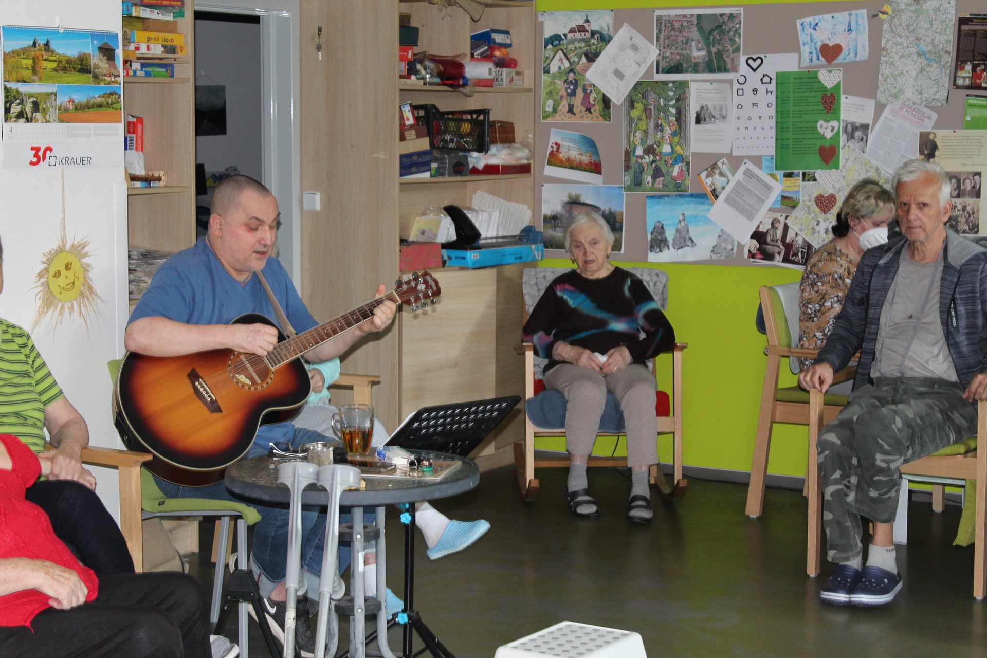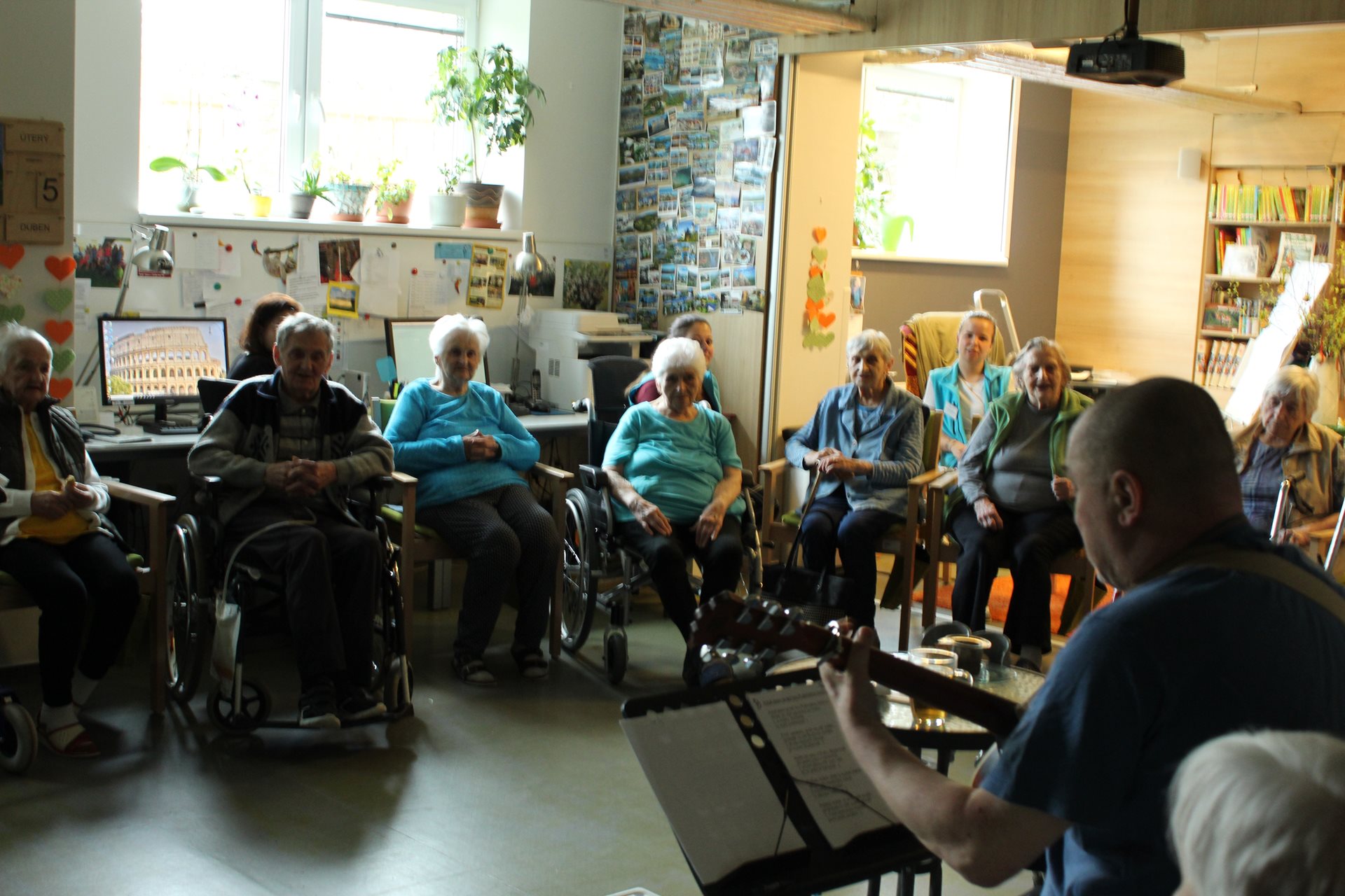 Opět u nás zazněla kytara, přijel nás pozdravit Jiří Klečka a zpívali jsme naživo: lidovky, moravské písničky, Matušku ...