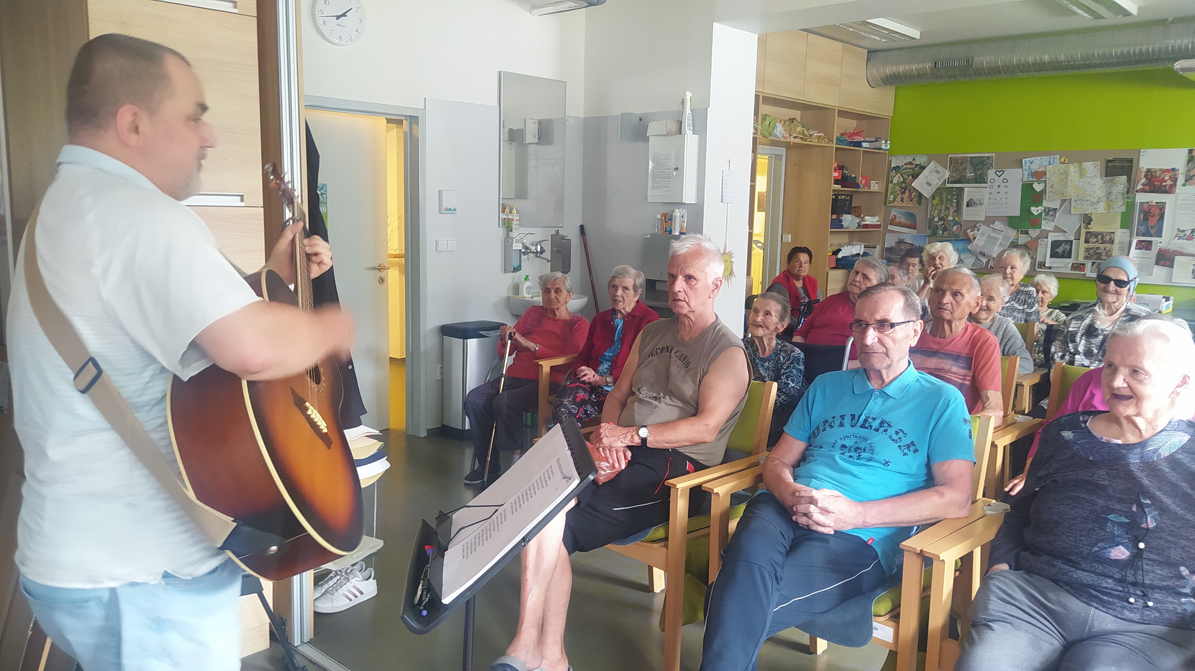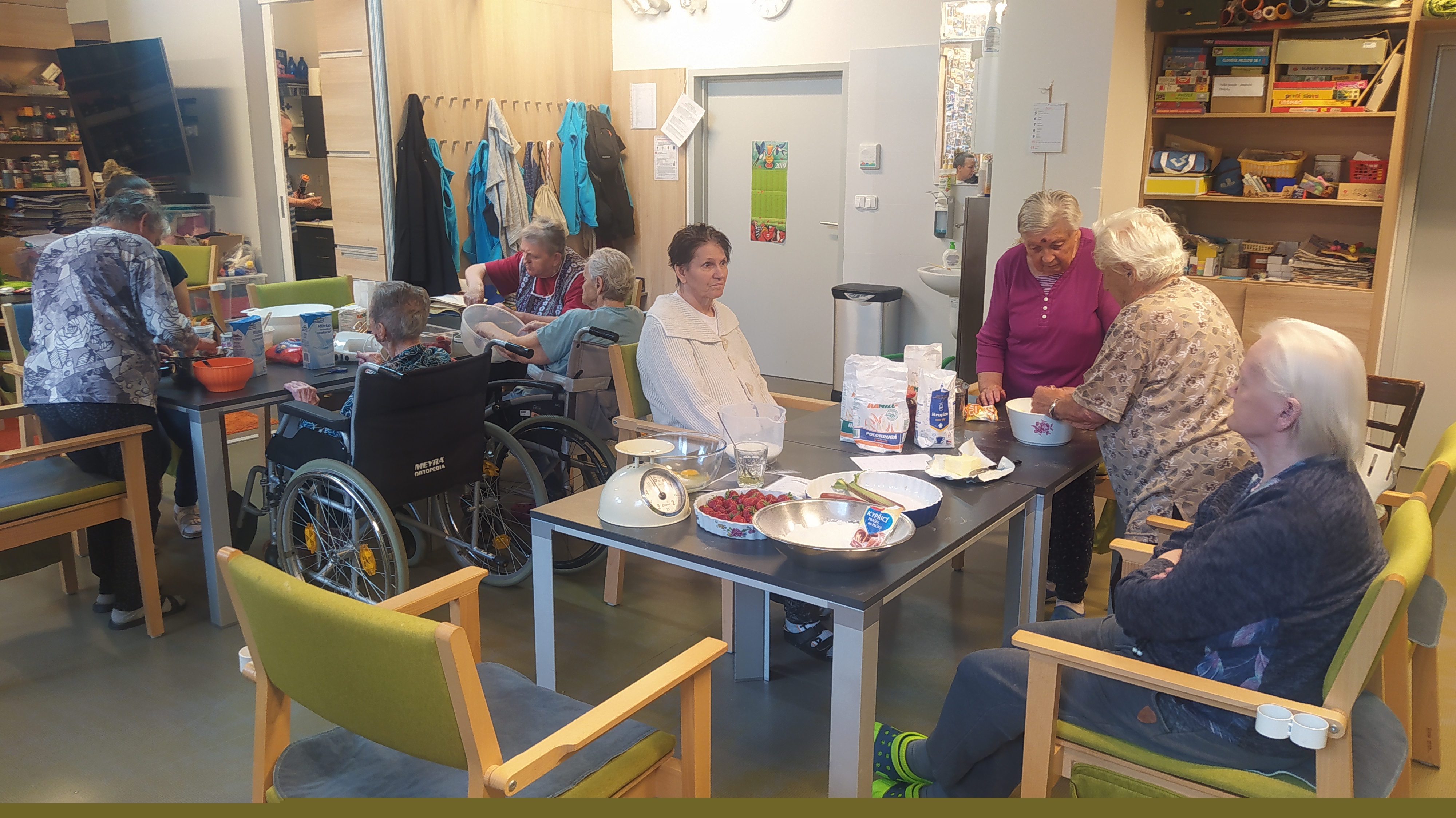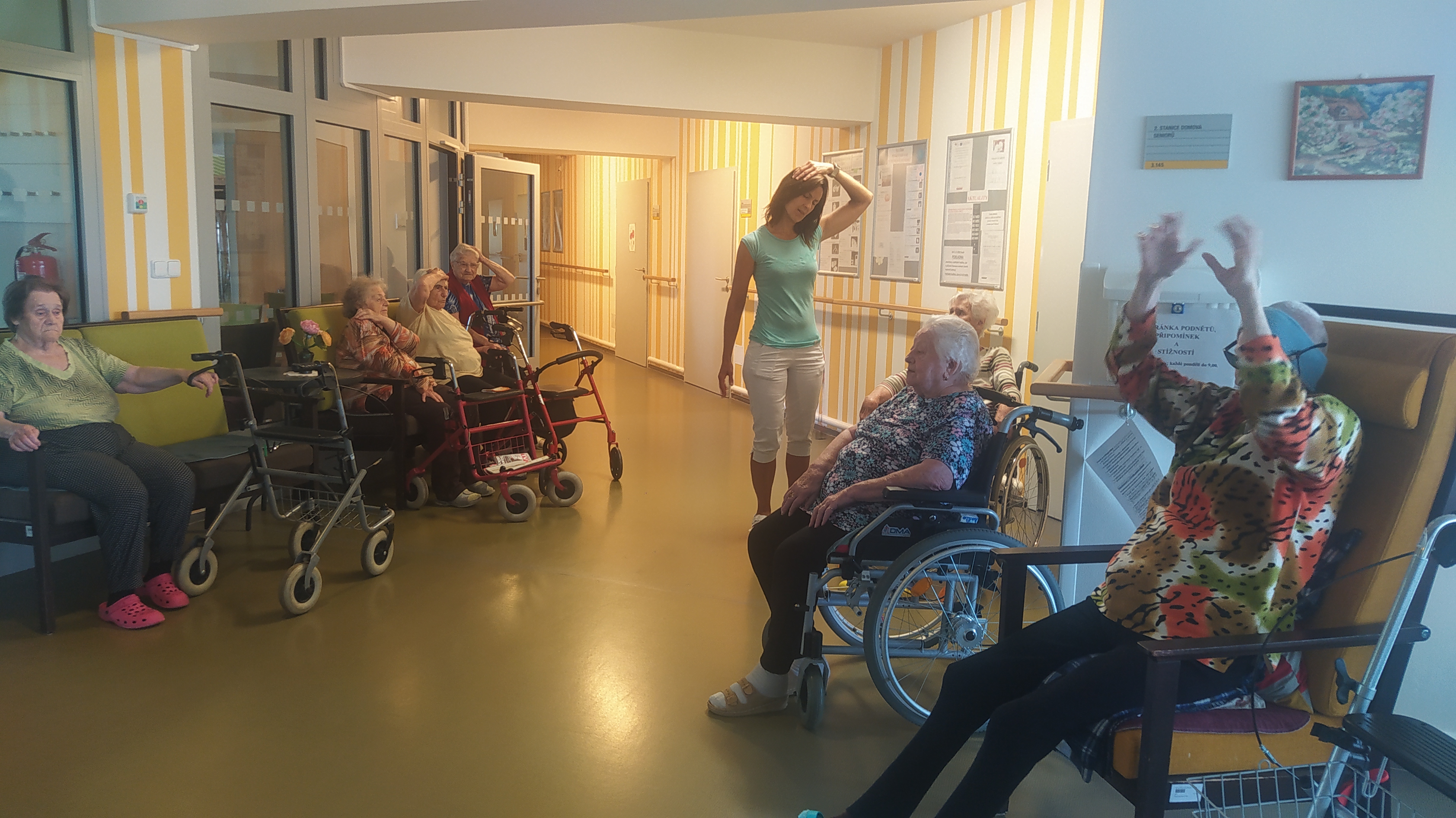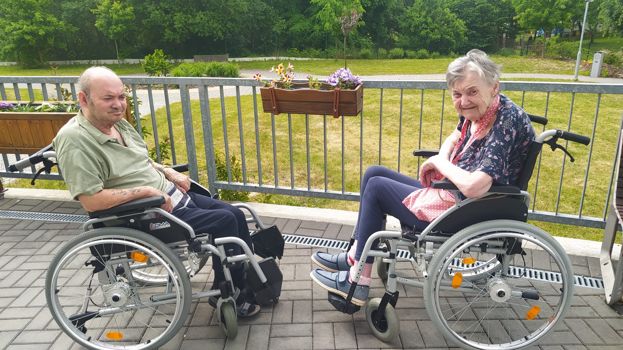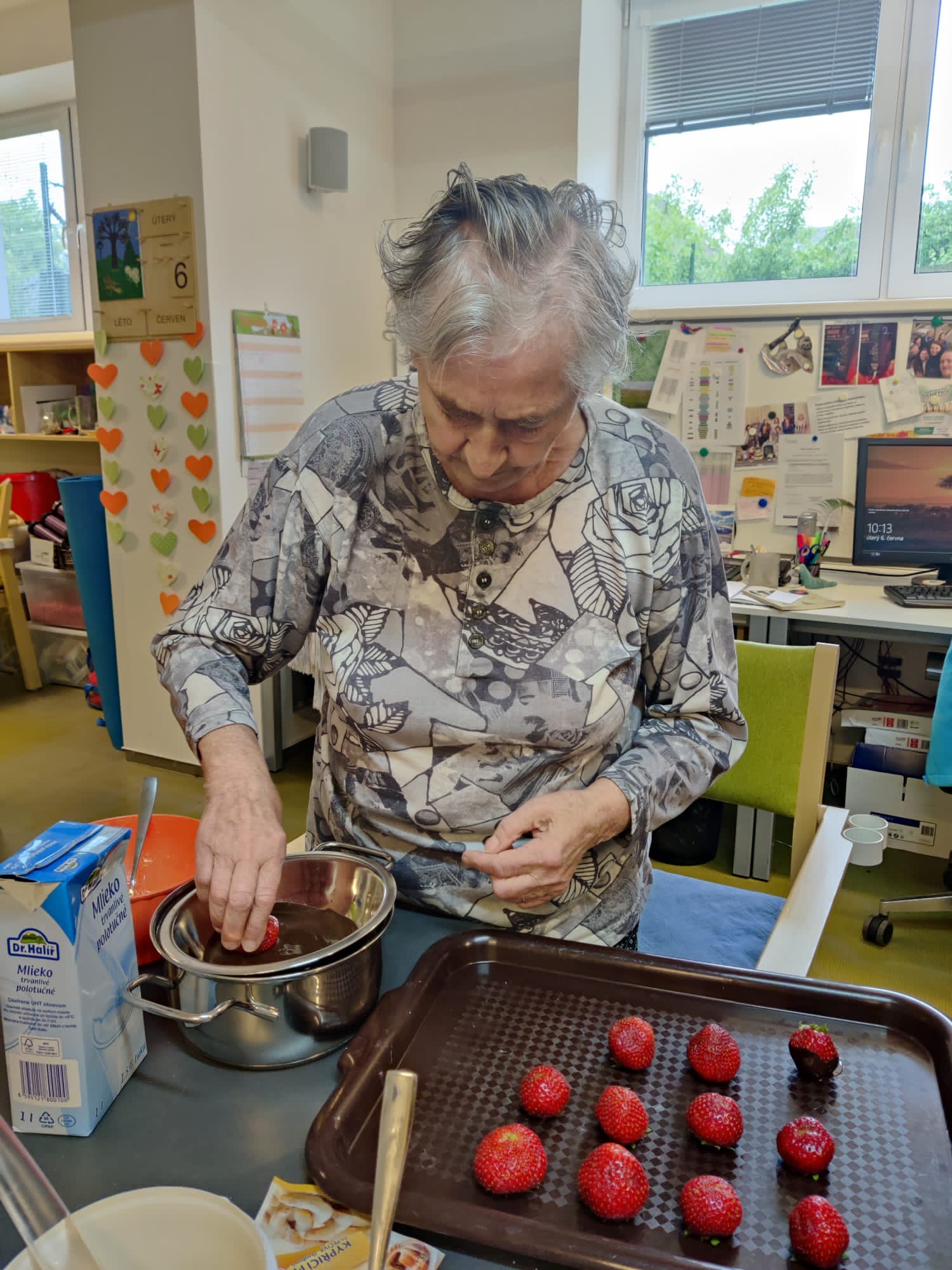 Léto pomalu nabírá na síle a my se už těšíme na letní výlety. V červnu jsme byli také dost aktivní: cvičili jsme společně na patrech, individuálně a s Kladruby. Upekli jsme ovocný koláč, se kterým jsme jeli na Olešku. Zpívali jsme s Jiřím Klečkou a Bárou Hrzánovou. V projektu "Ježíškova vnoučata" se splnilo přání a navštívili jsme ZOO Chleby. Potěšili nás naši čtyřnozí kamarádi a dokonce nám tu po zahradě pobíhal ztracený králík. Došlo i na první ochutnávky zmrzliny. Také u nás proběhla cvičná evakuace a jeli jsme na výstavu do Lysé nad Labem. Nový altán již plně slouží ke společnému setkávání a krásně nám rozkvetli nově osázené truhlíky na balkonech. A tak bychom mohli pokračovat ........