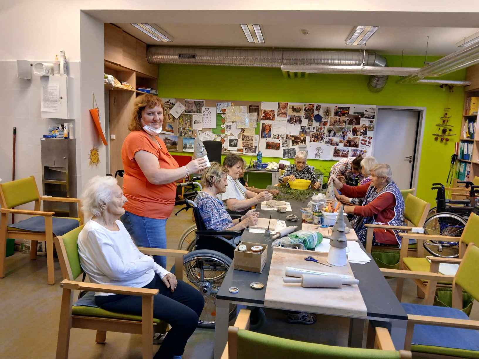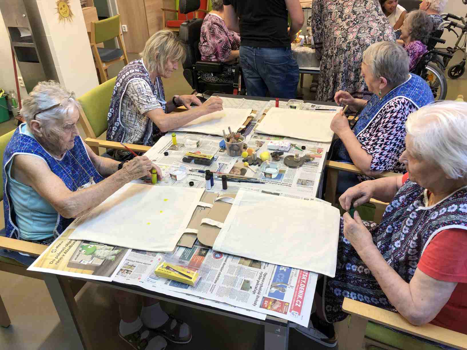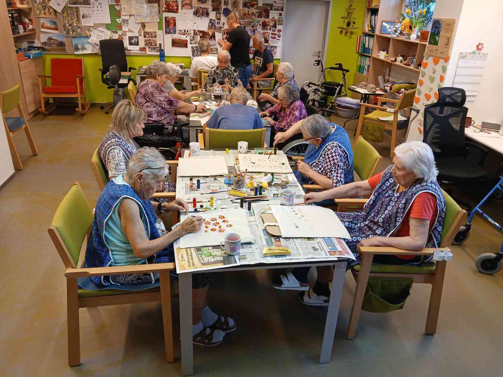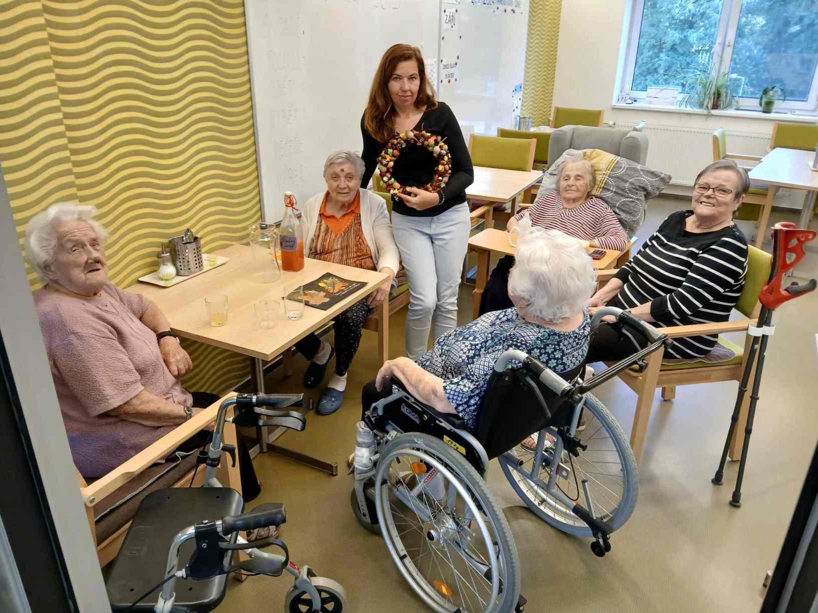 Léto se pomalu přehouplo do podzimu a tak venkovních aktivit začne pomalu ubývat. Sluníčko stále ještě hřálo a tak slunné dny jsme se snažili trávit v altánu a na zahradě. Zabalili jsme usušené bylinky, věnovali jsme se keramice i zdobení látkových tašek. Společně jsme trávili čas předčítáním, posezením s hudbou a tréninkem paměti. Zacvičili jsme si s naší fyzioterapeutkou, navštívili nás zvířecí kamarádi a využili jsme našich kadeřnických služeb. Navštívila nás paní učitelka z Dětského centra v Polipsech, aby nám předala výrobky, které děti pro nás připravily. A ještě jsme si stačili udělat výlet na farmu do Netušila.