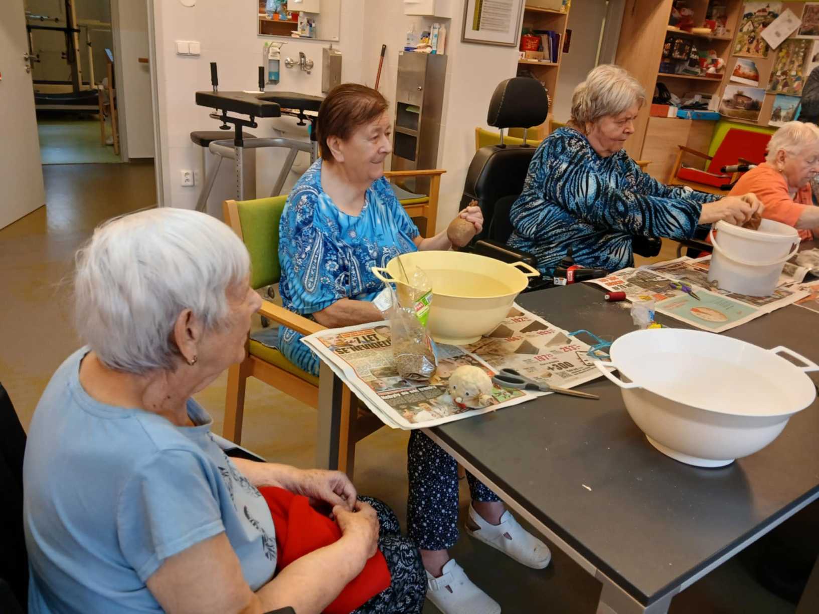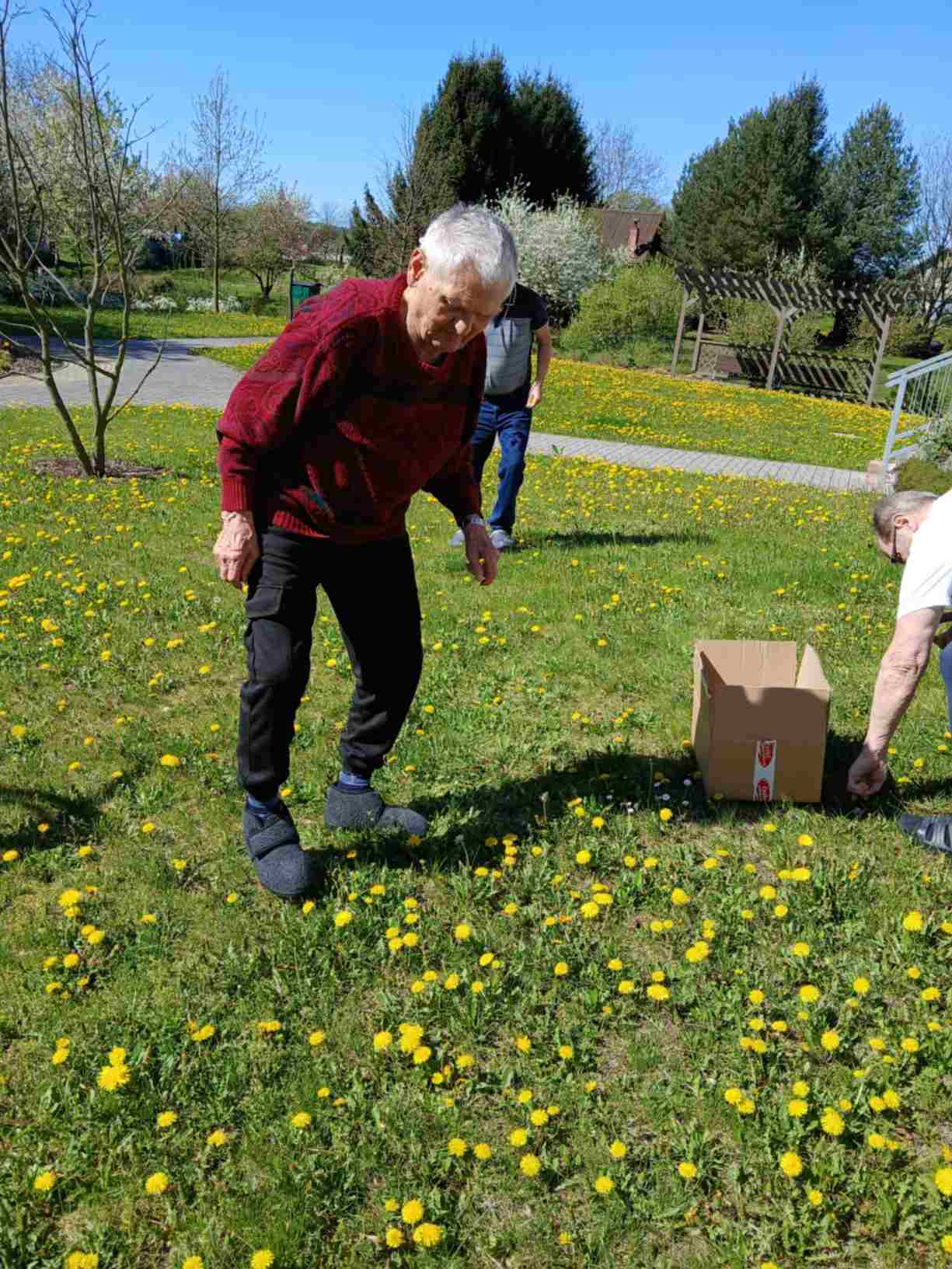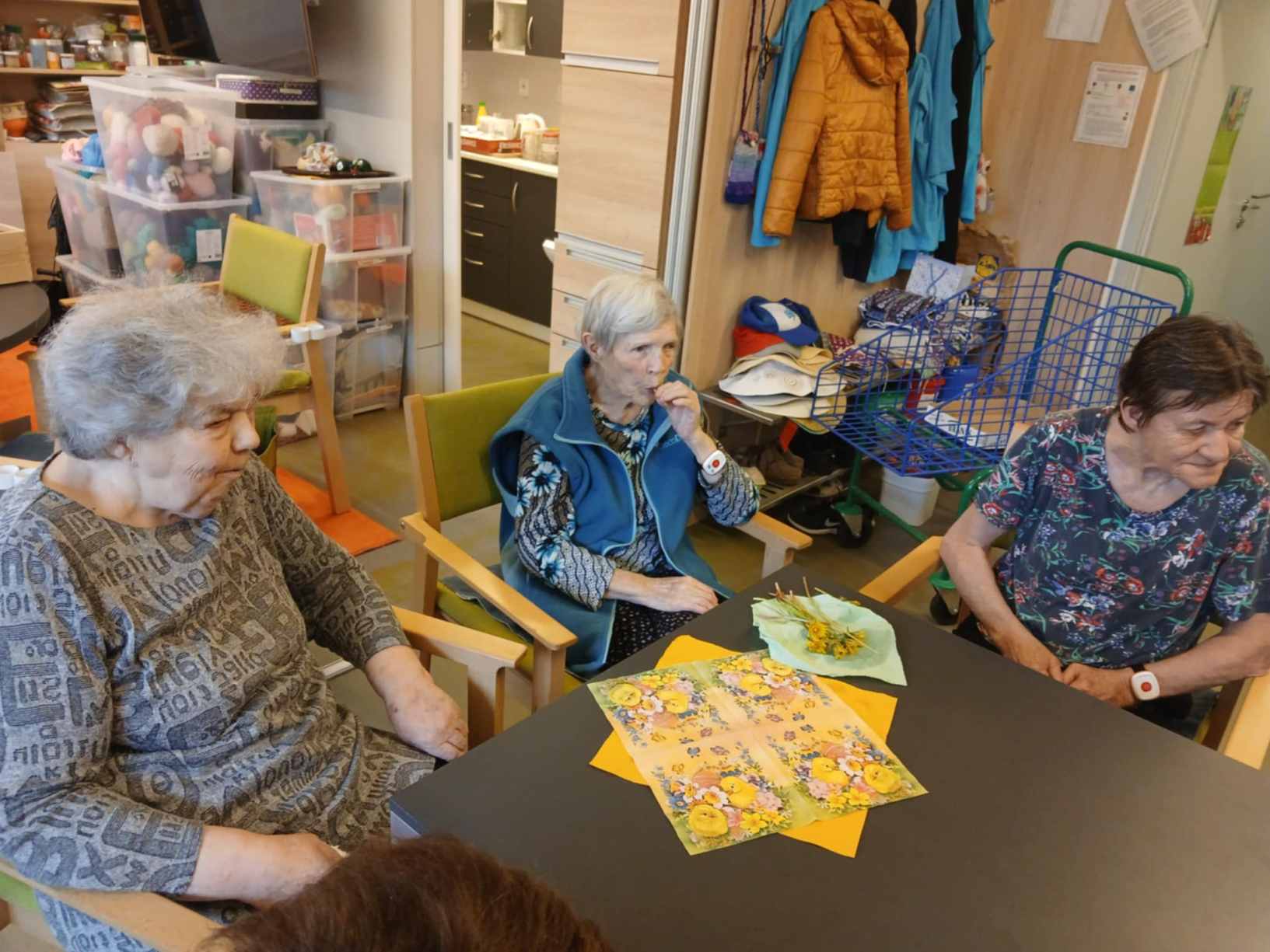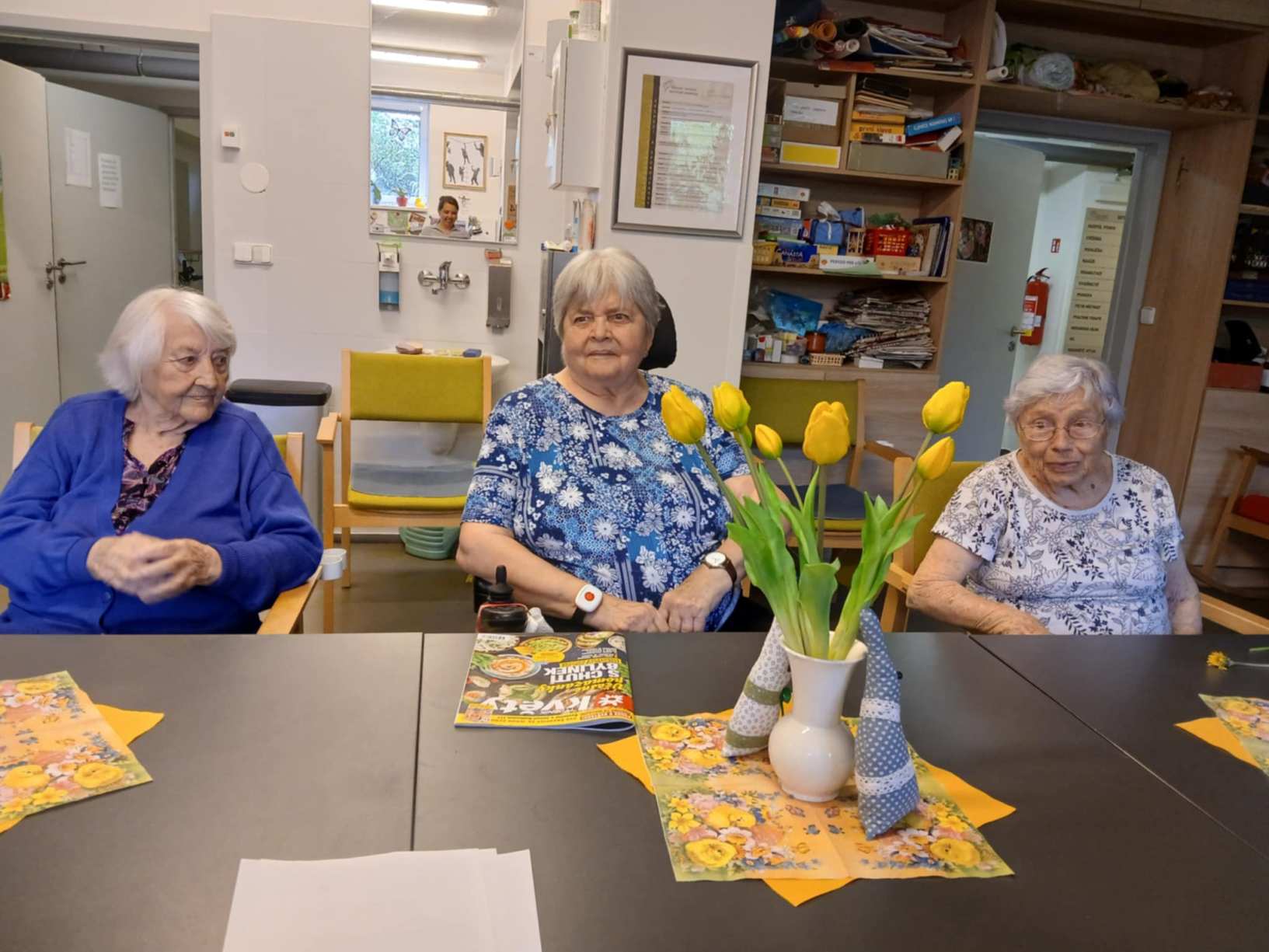Krásné dubnové počasí vybízelo k venkovním aktivitám. Nasbírali jsme pampelišky pro výrobu medu. Společně jsme se podíleli na výrobě "travňáků", malování tašek a výrobě pampeliškového medu. V naší kavárně nechyběla oslava pro dubnové oslavence. Tento měsíc jsme s naší klientkou oslavili krásné sté narozeniny. Cvičili jsme společně i individuálně a nejen tělo, ale i mysl. Poseděli jsme při poslechu starých gramodesek, nebo hráli žolíky na terase. V rámci výletu jsme zajeli na fotbalový zápas, který se uskutečnil na místním fotbalovém hřišti. Přišel za námi náš psí kamarád a dokonce i husa nebo poníci. V květnu se moc těšíme na floristický workshop s rodinami, tak si určitě udělejte čas.